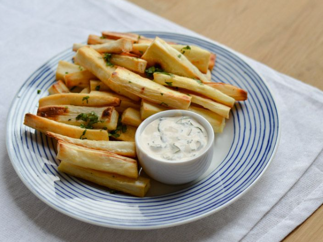 Baked Yuca El Sol Fries with Creamy Garlic Yogurt Dip
